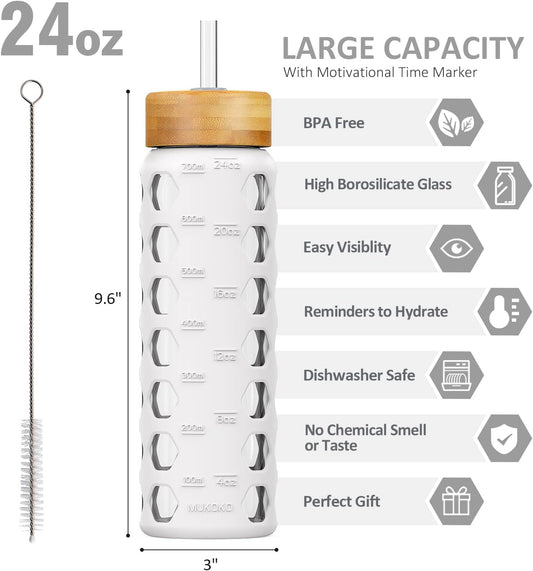 MUKOKO 24oz Glass Water Bottle with 2 Lids-Handle Flip Lid&Bamboo Straw Lid,Motivational Water Tumbler with Time Marker Reminder and Silicone Sleeve, Leakproof-White