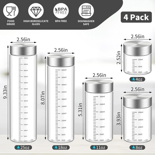 4 Oz Glass Bottles, 4 Pack Glass Jar with Lid, BPA Free, Borosilicate Glass, Stainless Steel Lids for Juicing, Smoothies, Infused Water, Beverage Storage
