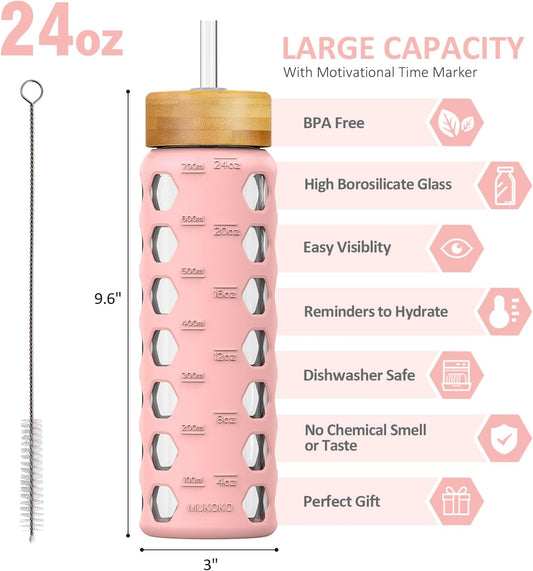 MUKOKO 24oz Glass Water Bottle with 2 Lids-Handle Flip Lid&Bamboo Straw Lid,Motivational Water Tumbler with Time Marker Reminder and Silicone Sleeve, Leakproof-Pink