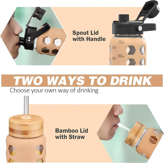 MUKOKO Glass Water Bottles, 32oz Glass Tumbler with Straw, Drinking Bottles with 2 Lids-Handle Spout Lid&Bamboo Straw Lid, Motivational Water Bottle with Time Marker and Silicone Sleeve, 1 Pack-Amber