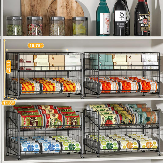 4-Pack Stackable Canned Food Organizer with Handles for Kitchen, Soda Can Organizer for Pantry Shelves, Wire Cabinet Shelf for Can Storage, Foldable Soda Dispenser, Patent Pending, Black