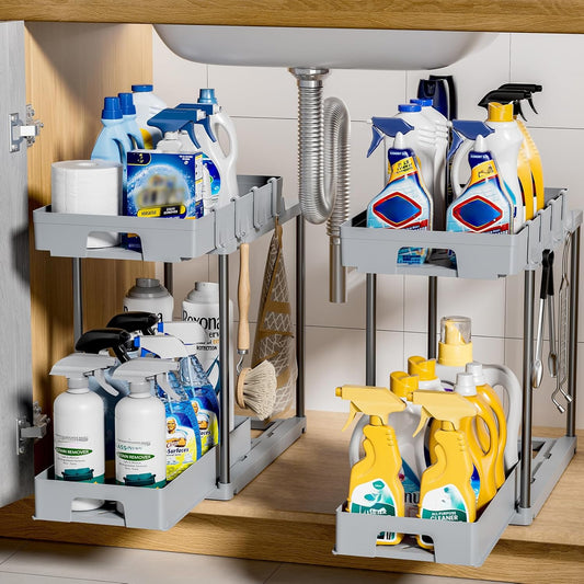Delamu Under Sink Organizers and Storage, 2 Pack Pull Out Kitchen Bathroom Cabinet Organizer, 2 Tier Grey Under Sink Storage for Bathroom Kitchen