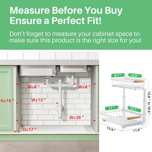 Under Sink Organizer, High Adjustable 2 Tier Under Kitchen Sink Organizer, Multi-Purpose Storage Shelf for Kitchen Bathroom Cabinet, White