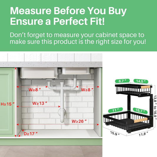 2 Tier Pull Out Cabinet Organizer ,Adjustable Width & Height,Expandable Pull-Out Drawers For Cabinets, Slide Out Shelves for Kitchen Cabinets / Countertop / Pantry,Heavy-Duty & Easy to Install(Black)