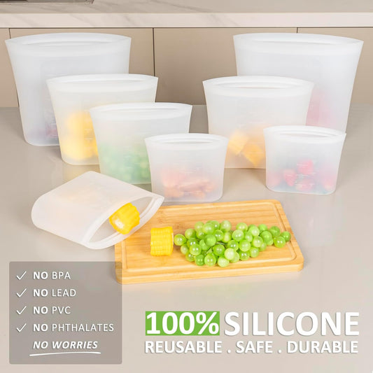 Reusable Sandwich Bags & Snack Bags Set, 8 Pack, 100% Silicone Reusable Storage Bag, Soft Shell Ziplock Silicone Food Storage Containers, Freezer Microwave Oven Dishwasher Safe, Translucent
