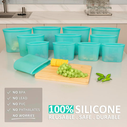 Reusable Food Bags, 12 Pack 100% Silicone Food Storage Bags Stand Up Zip Lock Container, Freezer Microwave Oven Dishwasher Safe, 4 Medium 4 Small 4 Extra Small, Aqua