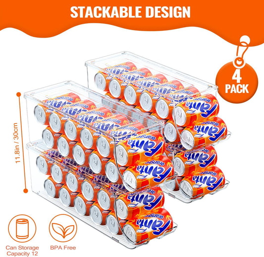 4 Pack Soda Can Organizer for Refrigerator, Stackable Canned Food Pop Cans Container Can Holder Dispenser with Lid for Fridge Rack Freezer, Clear Storage Bins-Holds 12 Cans Each (Transparent)