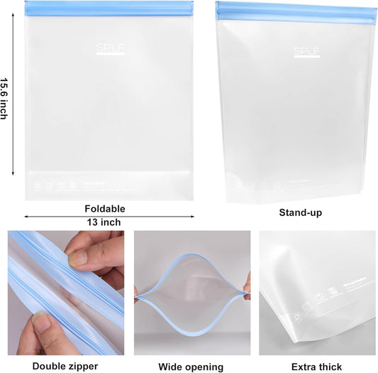 SPLF 6 Pack Stand-Up Reusable 2 Gallon Freezer Bags Dishwasher Safe, Reusable Freezer Bags 2 Gallon, Leakproof BPA Free Food Storage Bags for Marinate Meat, Veggies, Homemade Bread, Snack, Travel Item