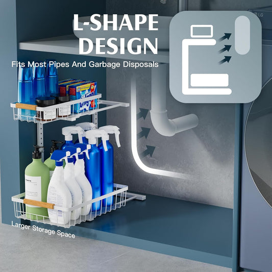 Metal Under Sink Organizers and Storage, 2 Tier Under Sink Organizer Pull Out, Adjustable Under Kitchen Sink Organizer, Sliding Cabinet Organizer for Bathroom, White