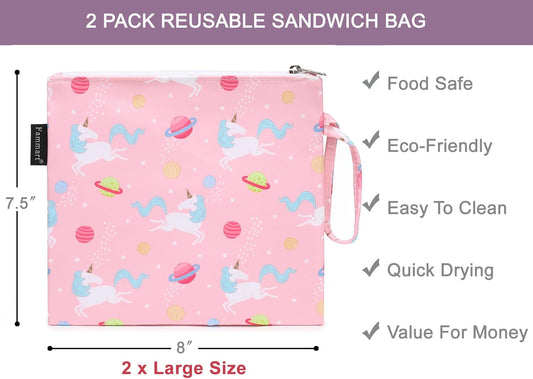Reusable Sandwich Bag/Snack Bag for Kids & Adults, Dual Layer Lunch Bag with Handle, Washable, Food Safe, BPA Free (2-Pack, Planet Unicorn)