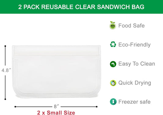 Clear Sandwich Bag/Snack Bag for Kids & Adults, Reusable Double Ziplock Cosmetic Bag,Makeup Travel Bag for Women Girls, Leakproof, Washable, Food Safe, BPA Free (2-Pack, Clear)