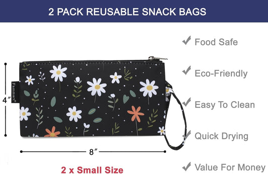 Reusable Sandwich Bag/Snack Bag for Kids & Adults, Dual Layer Lunch Bag with Handle, Washable, Food Safe, BPA Free (2-Pack, Daisy)