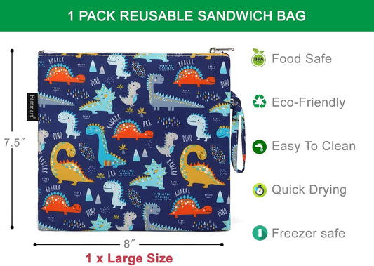 Reusable Sandwich Bag/Snack Bag for Kids & Adults, Dual Layer Lunch Bag with Handle, Cosmetic Bag Makeup Travel Bag for Women Girls, Washable, Food Safe, BPA Free (1-Pack, Dinosaur)