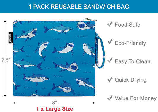 Reusable Sandwich Bag/Snack Bag for Kids & Adults, Dual Layer Lunch Bag with Handle, Cosmetic Bag Makeup Travel Bag for Women Girls, Washable, Food Safe, BPA Free (1-Pack, Shark)