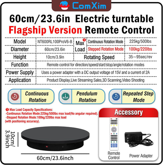 23.6In Remote Large Motorized electric turntable Rotating platform Photography Turntable Motorized lazy susan Base giratoria para for Photography,3D Scanner,Heavy duty display(Load Range:220~500lbs)