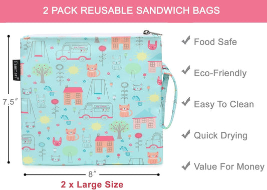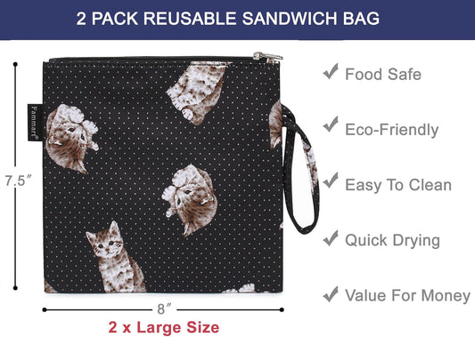 Reusable Sandwich Bag/Snack Bag for Kids & Adults, Dual Layer Lunch Bag with Handle, Washable, Food Safe, BPA Free (2-Pack, Colorful Cat)