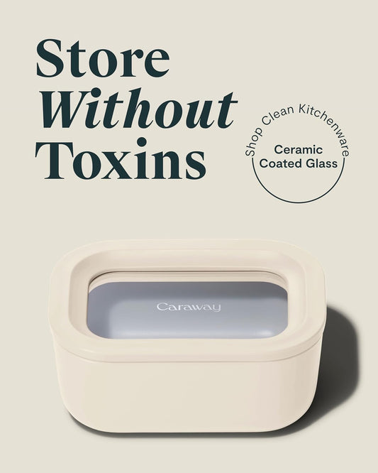 Caraway 2pc Glass Food Storage Set - 6.6 Cup Food Containers (2) - Ceramic Coated - Non Toxic, Non Stick Lunch Box with Lids. Dishwasher, Oven, & Microwave Safe - Cream