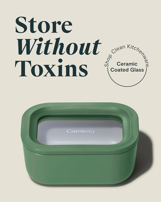 Caraway 2pc Glass Food Storage Set - 6.6 Cup Food Containers (2) - Ceramic Coated - Non Toxic, Non Stick Lunch Box with Lids. Dishwasher, Oven, & Microwave Safe - Sage
