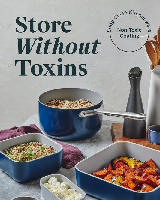 Caraway 2pc Glass Food Storage Set - 10 Cup Food Containers (2) - Ceramic Coated - Non Toxic, Non Stick Lunch Box with Lids. Dishwasher, Oven, & Microwave Safe - Navy