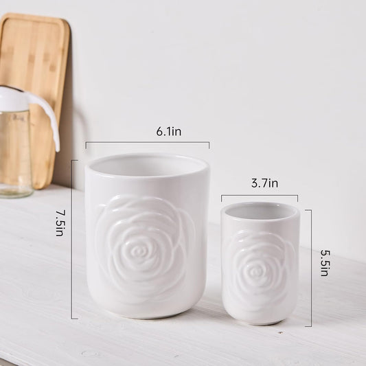 White Ceramic Utensil Holder Set of 2 - Rose Carved Design, Kitchen Countertop Utensil Organizer for Spatula, Spoon & Cooking Tools, Large (7.5") & Small (5.5"), Farmhouse Kitchen Counter Decor