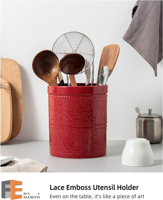 FUN ELEMENTS Kitchen Utensil Holder, 7.2" Super Large Utensil Crock Heavy and Stable Lace Emboss Ceramic Utensil Holder for Kitchen Counter (Christmas Red)