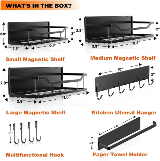 5 Pack Multifunctional Magnetic Shelves for Refrigerator Spice Rack & Washing Machine Organize, Include Paper Towel Holder, Kitchen Utensil Hanger and Hooks, Strong Magnet for Secure Hold (Black)
