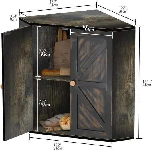 Corner Bread Box for Kitchen Counter Double Layer Bamboo Bread Storage Container Large Capacity Bread Storage Bin Farmhouse Breadbox Organizer (Antique Black)