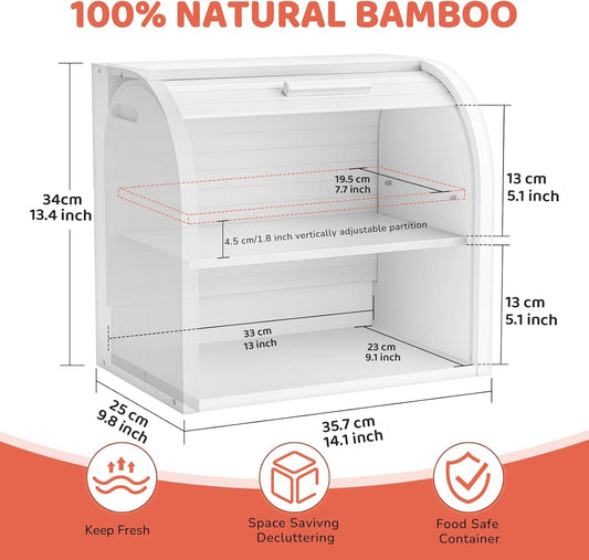 G.a HOMEFAVOR Bread Box: Large 2-Tier Bamboo Roll Top Bread Storage Container for Kitchen Counter, Bread Holder Food Bin for Countertop, Self-Assembly, White