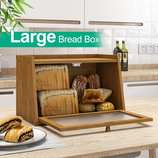 Large Bread Box for Kitchen Counter, Bamboo Bread Storage Container with Wavy Arcylic Transparent Door, Bamboo Wooden Farmhouse Bread Box for Your House