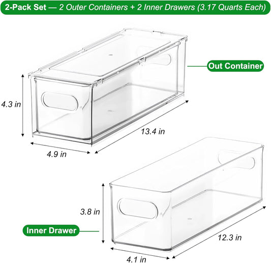 Taiuloo 2 Pack Stackable Refrigerator Organizer Bins with Pull-Out Drawer, Clear BPA-Free Food Storage Containers for Fridge Freezer, Kitchen Pantry Cabinet & Bathroom Vanity Organization