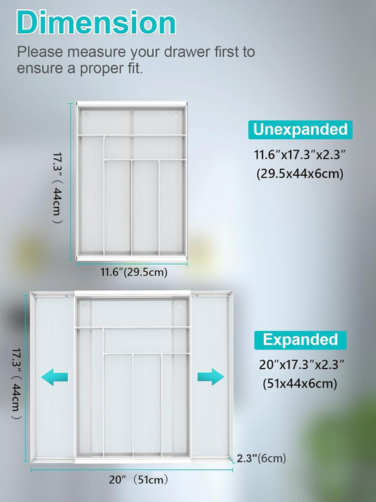 Silverware Organizer Metal Mesh, Large Drawer Organizer, Utensil Cutlery Tray for kitchen drawers, Expandable Flatware Organizer with 8 Compartment White 11.6"~20" x 17.3"