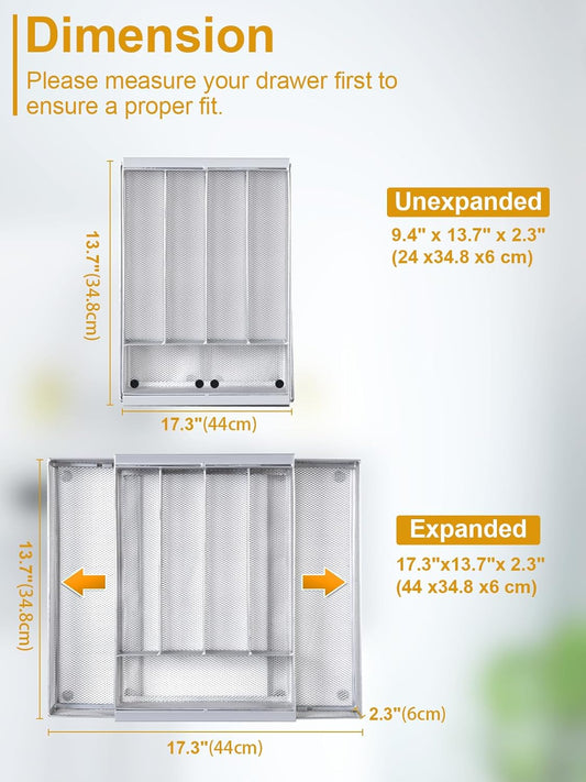Silverware Organizer Metal Mesh, Drawer Organizer, Utensil Cutlery Tray for kitchen drawers,Expandable Flatware Organizer with 7 Compartment White 9.4"~17.3" x 13.7"