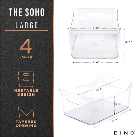 BINO | Plastic Organizer Bins, Large - 4 Pack | The SOHO Collection | Multi-Use | Pantry & Freezer Organizer Bins | Plastic Storage Containers for Home & Kitchen Org