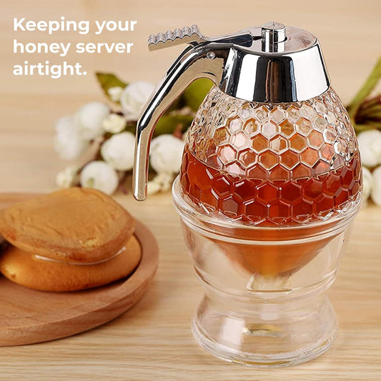 Hunnibi 8 oz Honey Syrup Dispenser No Drip - Coffee Syrup Dispenser with Stainless Steel Lid and Stand - No Mess Glass Honey Jar for Tea, Pancakes, Baking and Other Liquid Condiments - Easy to Refill
