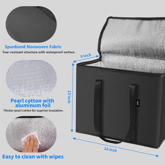2-Pack Cold Storage Food Bag, Insulated Grocery Bags for Delivery, Heavy Duty Reusable Bags with Zippered Top, Foldable and Durable for Frozen Foods and Shopping Black