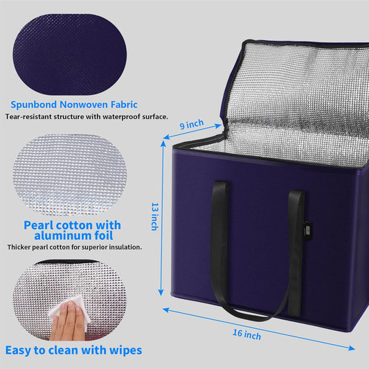 2-Pack Reusable Insulated Grocery Bags with Zippered Top, Heavy Duty Cooler Bags for Frozen Foods, Waterproof and Foldable Bag for Cold Storage & Travel– Dark Purple