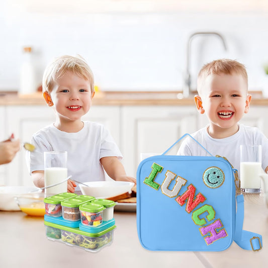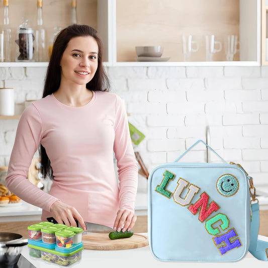 Insulated Lunch Bag With Adjustable Shoulder Strap, Nylon Preppy Lunch Box Large Insulated Lunch Bag Reusable Lunch Tote Bag with Smiley Preppy LunchBag for Girls School Travel Picnic (Blue)