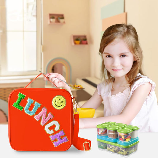 Insulated Lunch Bag With Adjustable Shoulder Strap, Nylon Preppy Lunch Box Large Insulated Lunch Bag Reusable Lunch Tote Bag with Smiley Preppy LunchBag for Girls School Travel Picnic (Orange)