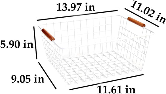 LeleCAT white wire baskets with Wooden Handles Storage Organizer Baskets, Household Refrigerator for Cabinets, Pantry, Closets, Bedrooms, kitchen - Set of 2(White)