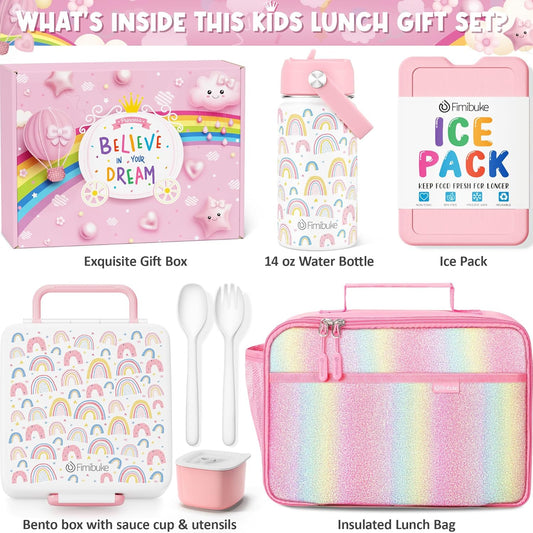 Fimibuke Kids Bento Lunch Box with 4 Compartments, Insulated lunch Bag, Stainless Steel Insulated Water Bottle, Ice Pack & Utensils Set, Birthday Gifts for Ages 3-12 Back to School Toddler Girls Boys