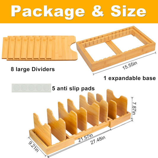 MinBoo Bamboo Expandable Pot Lid Organizer Pot Lid Holder, Pot and Pan Organizer Drawer Organizer for Pot Lids, Adjustable Dividers for Kitchen Cabinet Organizers and Storage,Large
