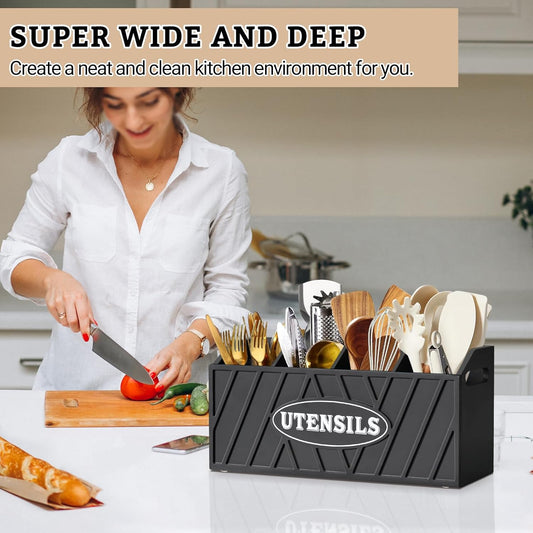 Extra Large Utensil Holder for Kitchen Counter, Matte Black Metal Cooking Utensil Caddy Organizer with Wooden Draining Base, Countertop Spatula Cutlery Storage with Silicone Dish Drying Mat
