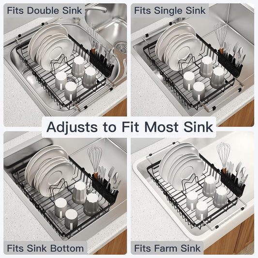 Over the Sink Dish Drying Rack,In Sink Dish Drying Racks,Expandable Dish Rack Over Sink Counter,Adjustable Dish Drainer for Inside Sink with Utensil Holder, Stainless Steel Dish Strainer Large Size