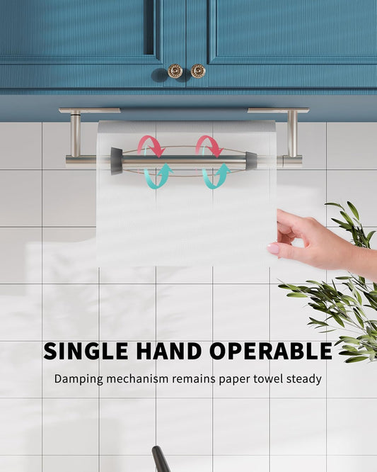Paper Towel Holder Under Cabinet, Self Adhesive or Wall Mount Hanging Paper Towel Holder with Damping Effect, Single Hand Operable, Stainless Steel for Kitchen Bathroom (Silver)