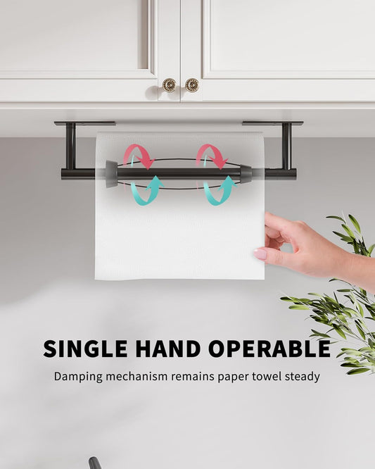 Paper Towel Holder Under Cabinet, Self Adhesive or Wall Mount Matte Black Hanging Paper Towel Holder with Damping Effect, Single Hand Operable, Stainless Steel for Kitchen Bathroom