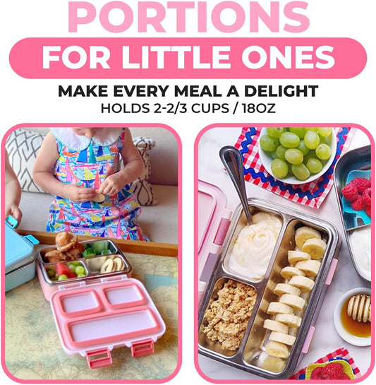 Stainless Steel Lunch Box for Baby Toddlers Girls, Mini Bento, 3 Eco Metal Portion Sections Leakproof Lid, Pre-School Daycare Lunches, Toddler Kids Spill-Proof Snack Container, 18 oz/550 mL Pink