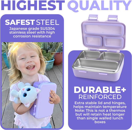 Small Stainless Steel Lunch Box for Baby Toddlers Girls, Mini Bento, 3 Eco Metal Portion Sections Leakproof Lid, Pre-School Daycare Lunches, Toddler Spill-Proof Snack Container, 18 oz/550 mL Purple