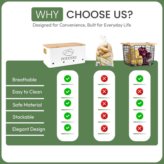 Potato Onion and Garlic Storage Bins with Wooden Lid & Breathable Holes – Rustic Farmhouse Stackable Kitchen Vegetables Canisters with Ventilation & Side Handles Space Saving – Set of 3