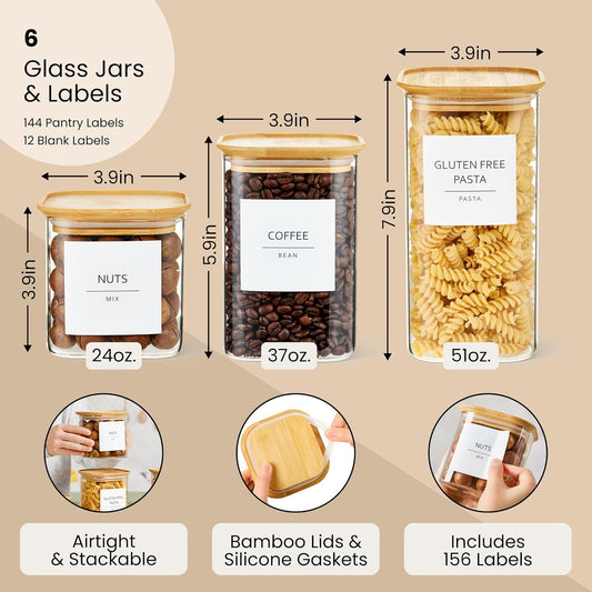 Talented Kitchen Square Glass Food Storage Containers - Airtight & Labeled Glass Kitchen Storage Containers - Space-Saving Stackable Square Pantry Jars - Pack of 6, 24/37/51 fl oz
