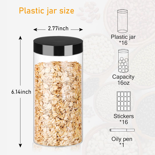 Plastic Jars with Lids 16OZ 16PCS Small Empty Slime Cosmetics Containers Clear Gift Food Jars Round PET Cream Jars with Black Lids Pen Labels for Kitchen Storage Spices Dry Food Butter